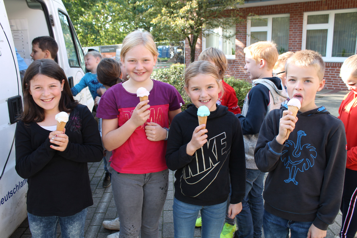 Am letzten Schultag vor den Herbstferien haben wir dann noch eine ganz tolle Sache erlebt. Auf einmal stand der Thies-Eiswagen vor der Schule. Jedes Kind durfte sich ein leckeres Eis abholen. Mit dieser grandiosen Aktion hat uns der Förderverein ein ganz großes Geschenk gemacht. Ich habe unsere Kinder (und uns Lehrerinnen) sehr glücklich gesehen....soooooo viele bunte lachende Eisgesichter... herrlich!